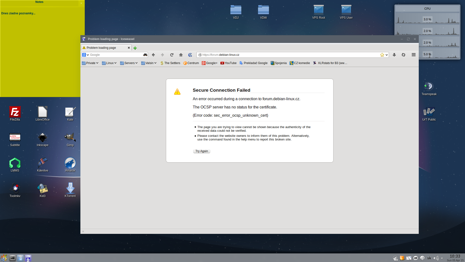 Od piatka sa stretavam s problemom nacitania fora a to konkrete ze mi forum vobec nenacita musim chvilu cakat a po nejakej tej piatej minute to ide. Konkretne mi vypise chybu bespecne pripojenie zlyhalo viz screen.